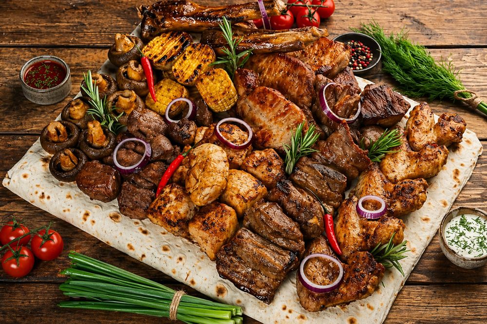 Шашлык из баранины — 400 гр., свиная шейка — 300 гр., свинина на кости — 300 гр., свиные ребрышки — 300 гр., куриное филе — 400 гр., грибы на углях — 200 гр., картофель печёный — 400 гр., лаваш — 4 шт., соус — 4 порции.