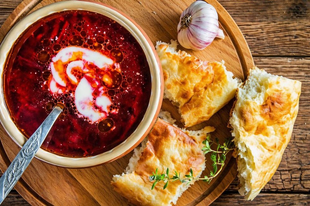 Насыщенный свекольный суп с мясом и овощами, подаётся со сметаной и свежим хлебом