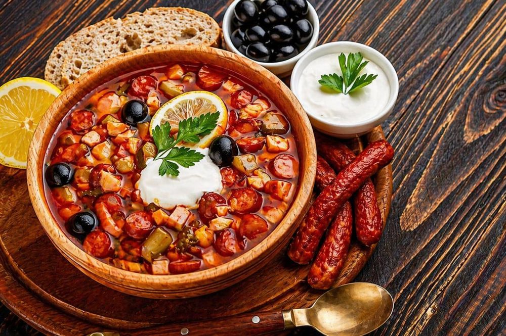 Насыщенный мясной суп с копчёностями, соленьями и оливками, подаётся со сметаной и лимоном