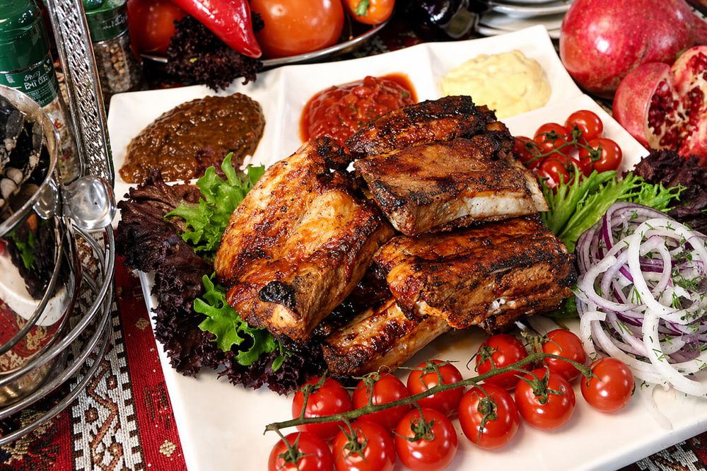 Шашлык из свиных ребрышек. Подается с луком и зеленью.