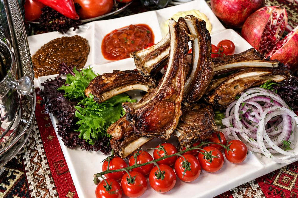 Шашлык из бараньей корейки. Подается с луком и зеленью.