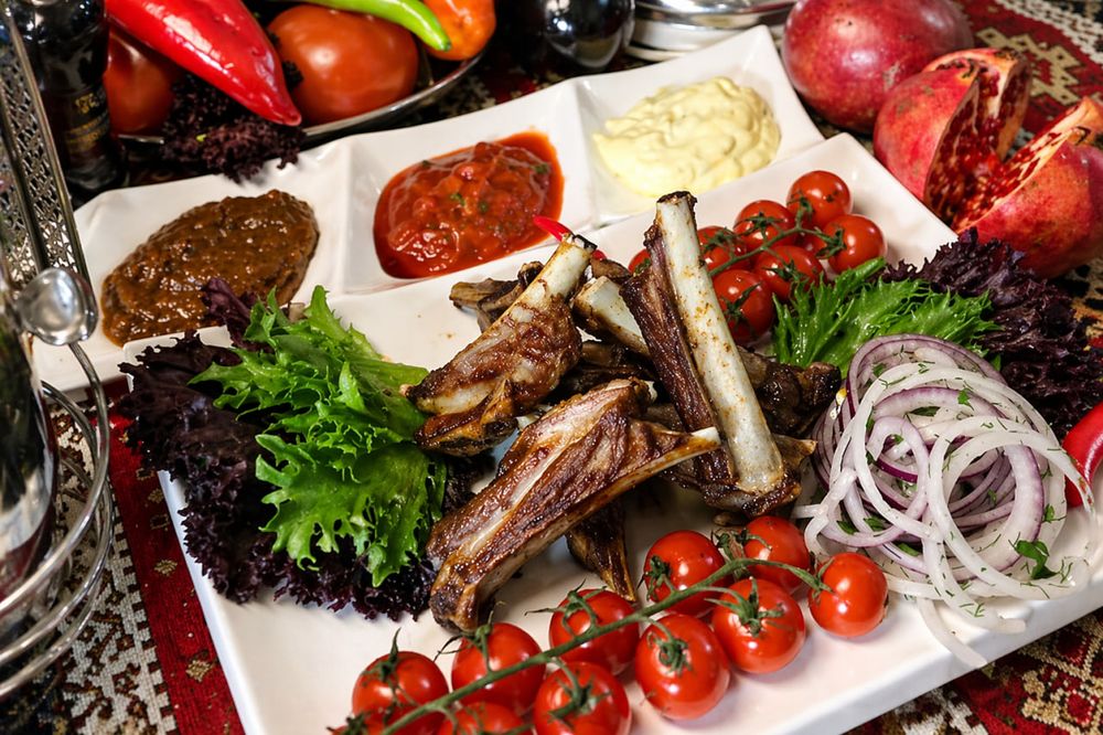 Шашлык из бараньих ребрышек. Подается с луком и зеленью.
